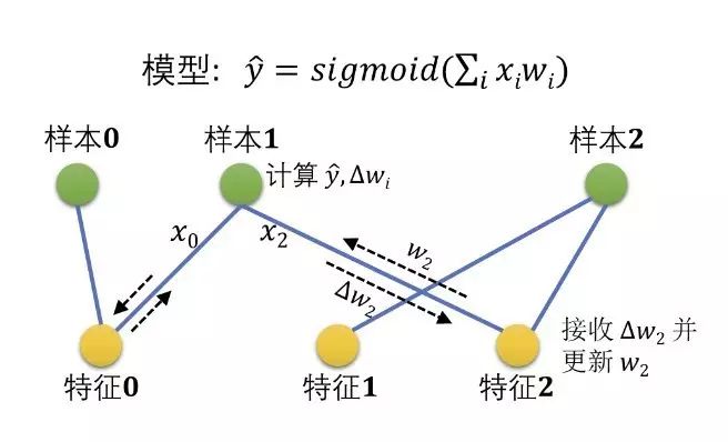 下图表示了如何将逻辑回归(LR: Logistic Regression)计算抽象成图计算。其中的绿色和黄色顶点分别表示样本(sample)和特征(feature),而联结它们的蓝色边则是 “样本具有特征” 关系。样本点上具有标签y,特征上具有权重w,而LR的目的就是希望通过回归计算不断更新各个w,从而得到适合该模型的权重w,以便通过此模型为只具有特征关系的样本预测标签。