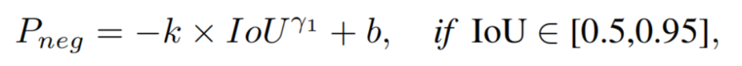 根据COCO的评价指标,小于θ的IoU是一个错误预测的充分条件。这意味着一个不满足IoU度量的预测边界框将被视为一个负样本检测,即使它有一个很高的cls分数。也就是说,IoU是确定成为一个负样本的概率的唯一因素,用 表示。由于COCO采用了0.5~0.95的IoU区间来估计AP,因此边界框的概率 应满足以下规则: