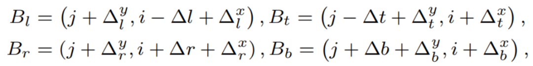 由于pos和neg加权函数都以IoU作为输入,更准确的IoU可以促使更高质量的样本,有利于学习更强的特征。作者提出一个Box Refinement操作,基于预测偏移图 ,其中 分别表示从当前Anchor中心到最左边的l、最上面的r、最右边的r和最下面的b边的预测距离,如图4所示。由于靠近物体边界的点更有可能预测准确的位置,所以作者设计了一个可学习的预测模块基于粗边界框为每边生成一个边界点。