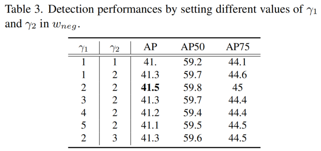 作者还进行了几个实验来研究DW对超参数 和 的鲁棒性,这些参数用于调节负样本权重的相对尺度。使用不同的 和 组合得到的AP结果范围为41~41.5,如表所示。这意味着DW的性能对这2个超参数不敏感。因此,在所有的实验中都采用了 , 。