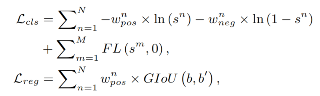 其中N和M分别是Anchor的总数,FL是Focal Loss,GIoU回归损失,s时预测的cls得分,b和b'分别是预测框和GT的位置。