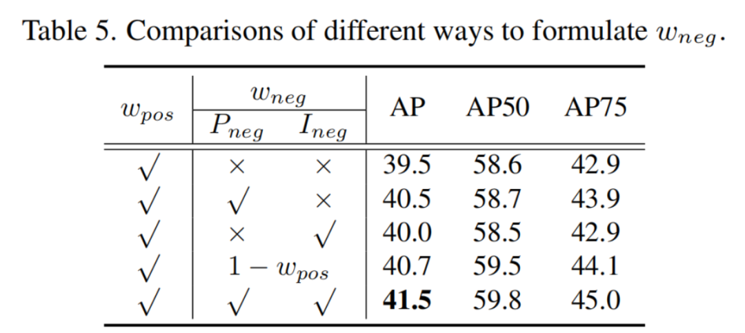 通过用其他替代方法来研究它的影响,如表所示。可以看到,只使用pos权重会将性能降低到39.5,这表明对于一些低质量的Anchor,只分配它们小的 不足以降低它们的Rank分数。它们可以强制以更大的 Rank在后面,在测试期间带来更高的AP。