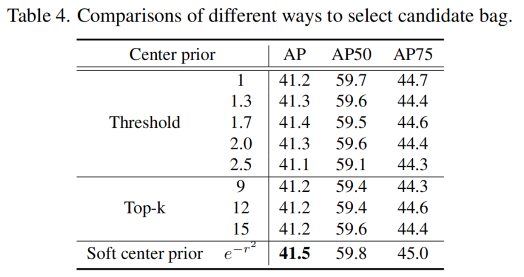 作为目标检测的常见做法,Soft LA只应用于候选集的Anchor。作者测试了3种候选集的构建方法,它们都是基于从Anchor到相应的GT中心的距离r(由特征stride归一化)。