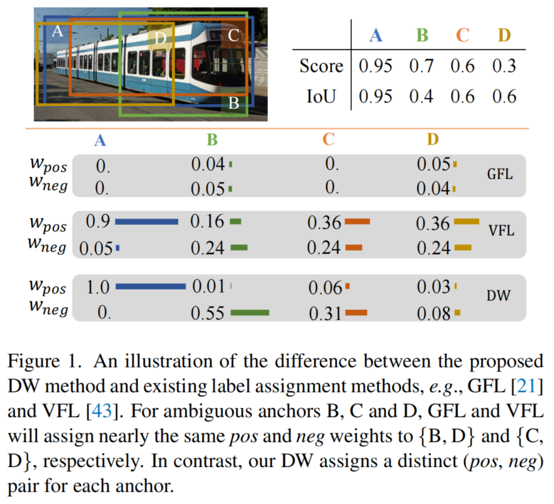 通过这种方法,在推断中,cls得分越高、位置更精确的边界框在NMS之后会有更大的概率保存下来,而那些位置不精确的边界框会排在后面并被过滤掉。如图1所示,DW通过分配不同的Anchor(pos、neg)权重对来区分4种不同的Anchor,从而为检测器提供更细粒度的监督训练信号。