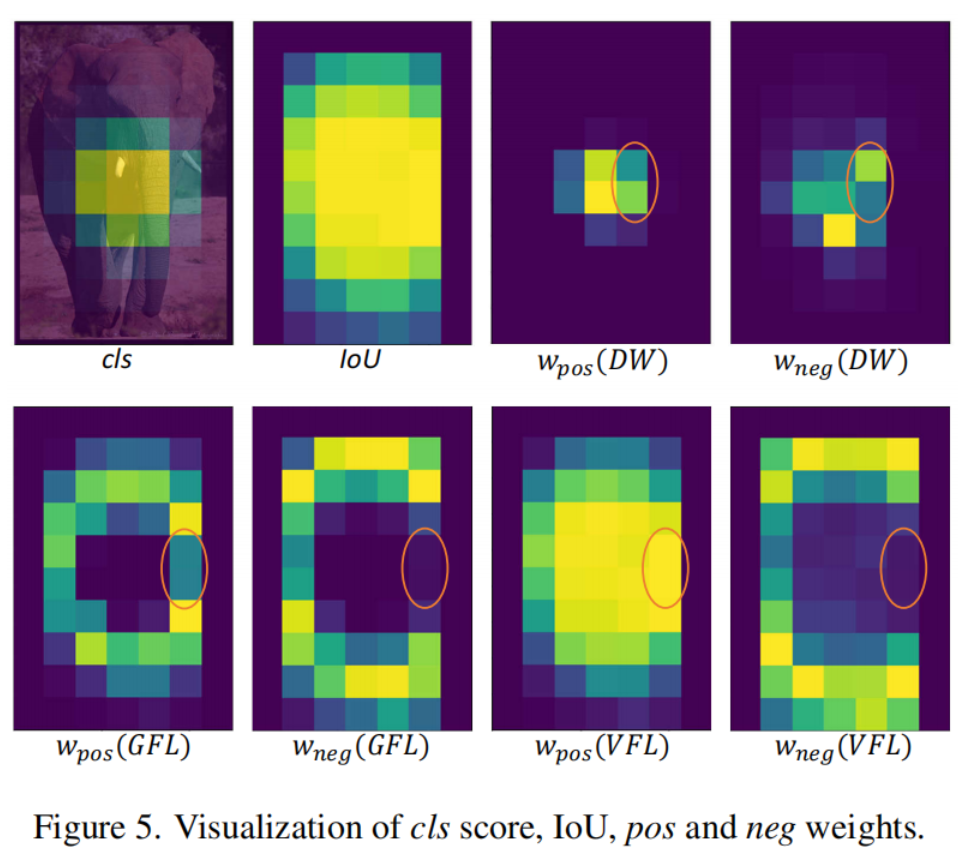 为了进一步了解DW与现有方法的区别,我们在图5中展示了DW的cls评分、IoU、pos和负性权重以及两种代表性方法GFL和VFL的可视化图。可以看出,DW中的pos和负性权重主要集中在GT的中心区域,而GFL和VFL则在更宽的区域上分配权重。这种差异意味着DW可以更多地关注重要的样本,并减少容易获得的样本的贡献,比如那些在物体边界附近的样本。这就是为什么DW对候选包的选择更稳健。