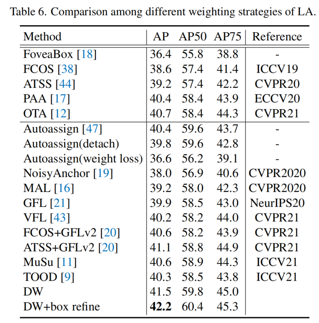 通过对MSCOCO的综合实验,证明了提出的DW方法的优势。特别是,它在单尺度训练方案下,将基于ResNet-50的FCOS检测器在COCO验证集上的结果提升到了42.2AP,超过了其他LA方法。
