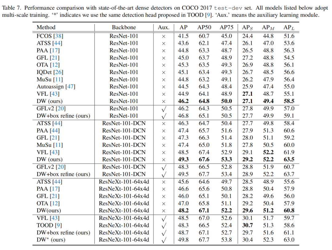 在没有Box Refinement的情况下,DW方法达到41.5AP,这是第1个在不增加FCOS-ResNet-50的情况下,在COCO上实现超过41AP性能的方法。通过Box Refinement,DW可达到42.2AP,如表6所示。表7还显示,Box Refinement可以持续地提高具有不同Backbone的DW的性能。