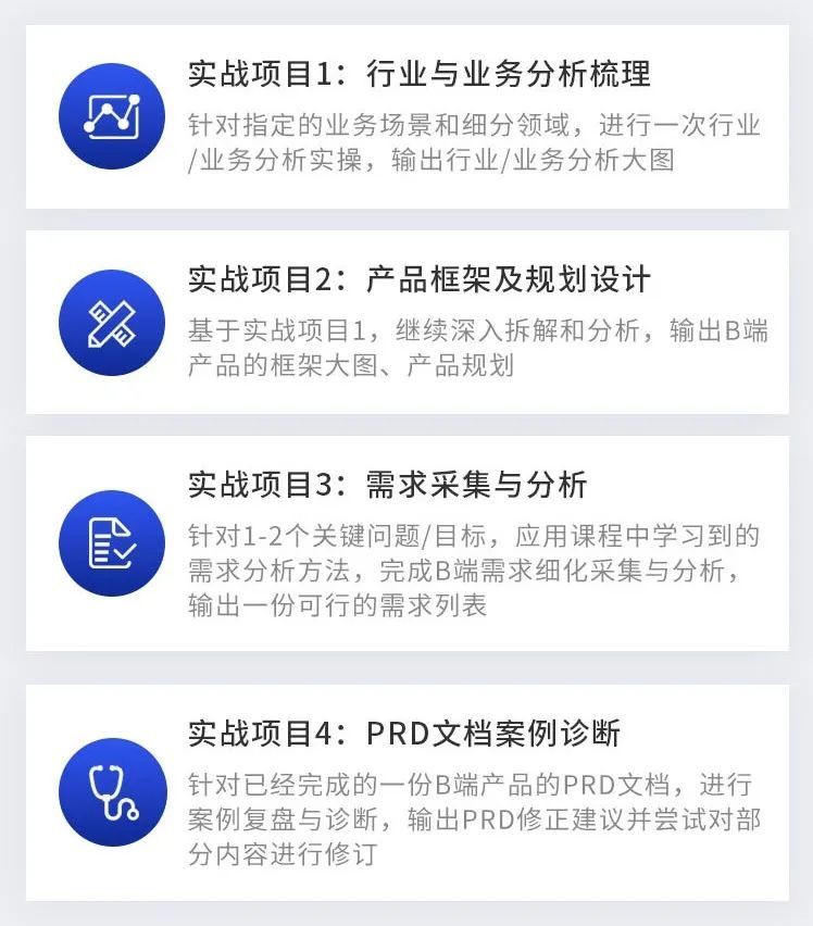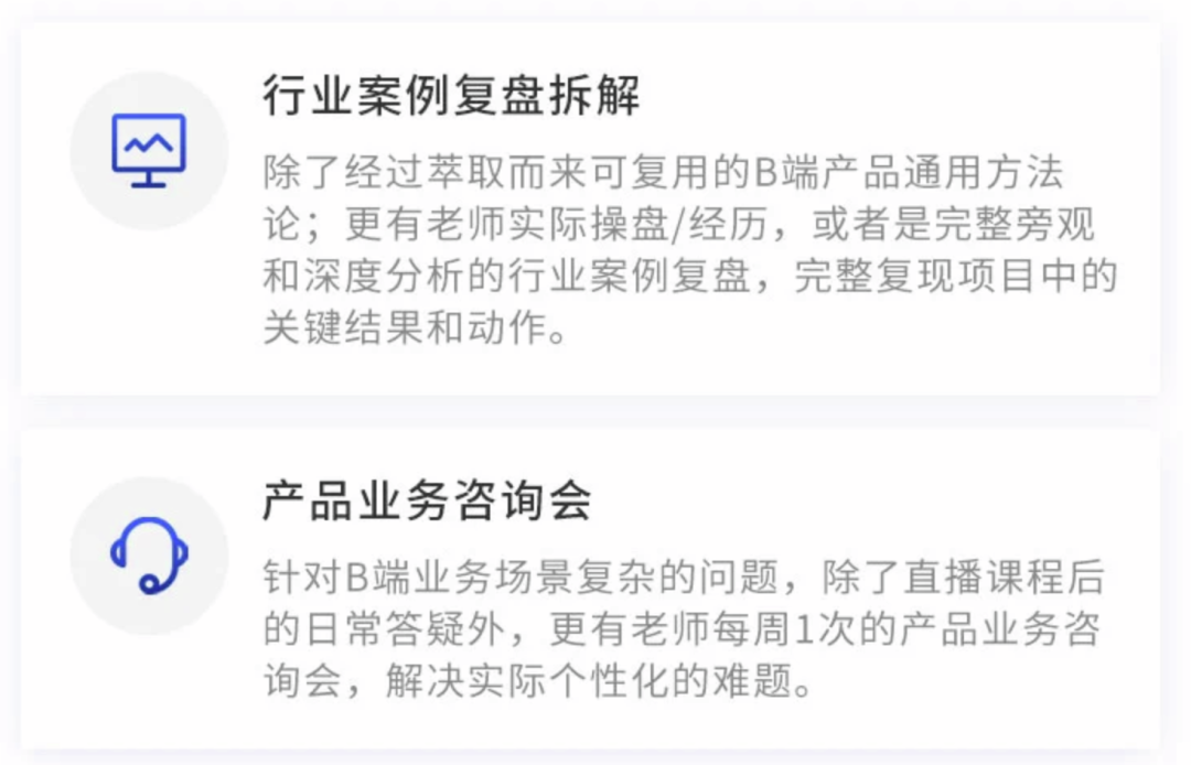 24堂在线直播课程助你系统学习 + 2位10年+实战经验导师亲自带班 + 8大模块帮你构建B端产品经理能力模型 + 4个实战项目帮你加强知识内容吸收 + 2大行业案例复盘帮你提炼通用方法 + 12场产品业务咨询会替你解决个性化难题 + 12场学习成果交流会助你学习垂直领域经验,全面以“助你构建可复用B端产品建设系统方法论”为导向。
