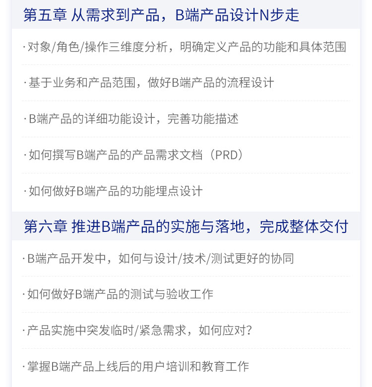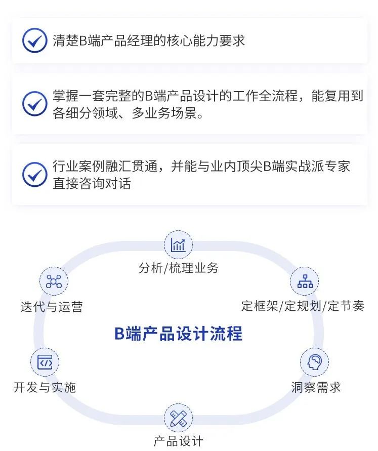 因此课程将会围绕“业务分析梳理-产品框架规划-需求洞察-产品设计”这4个B端产品设计中的重难点展开,同时包含开发与实施、迭代与运营的工作全流程。