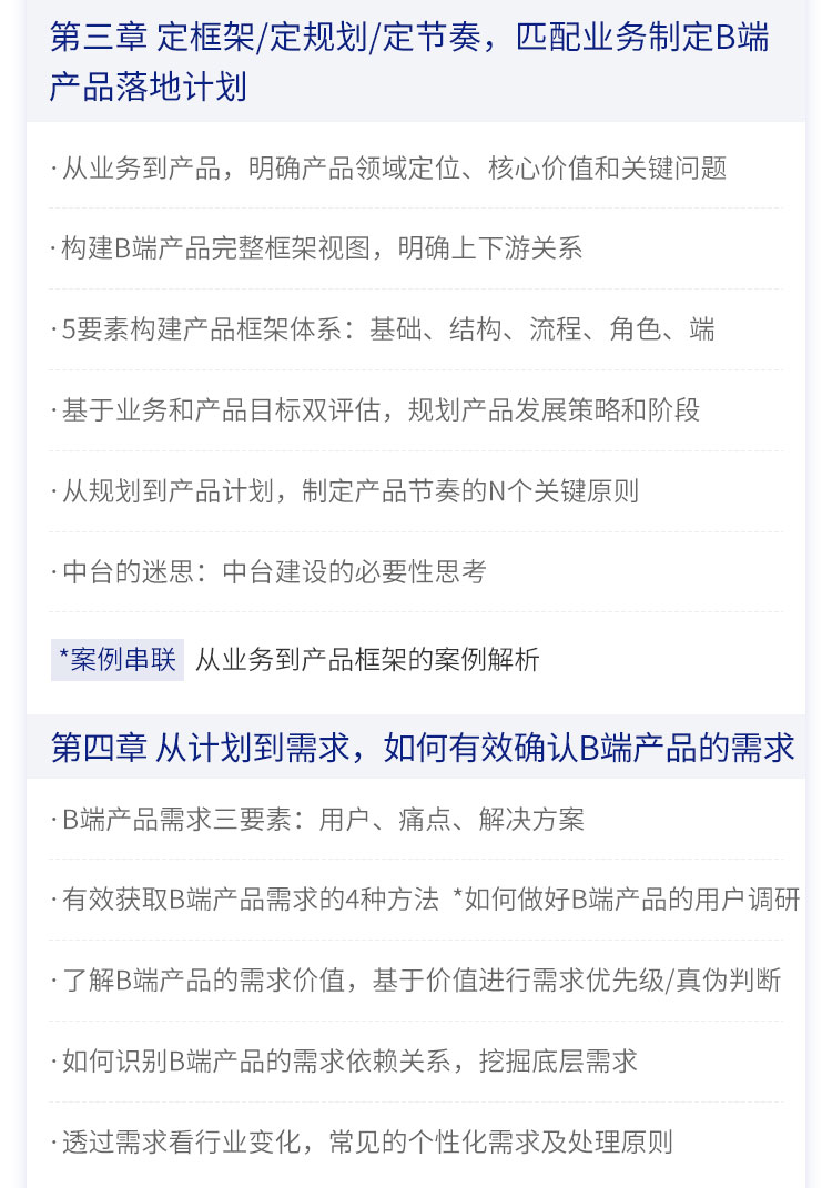 除此之外,B端产品经理除了掌握核心工作技能外,还需要具备极强的抽象能力、沟通协作、技术理解力,这些我们的课程中也给到了可以落地的方法,详细看大纲感受一下。
