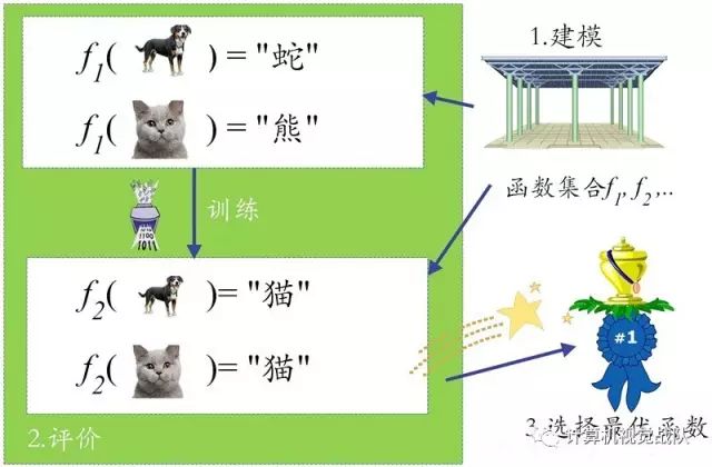 这样一来,我们就需要构建一个评估体系,来辨别函数的好坏。当然,这中间自然需要训练数据(training data)来“培养”函数的好品质(如图6所示)。在第一小节中,我们提到,学习的核心就是性能改善,在图6中,通过训练数据,我们把f1改善为f2的样子,性能(判定的准确度)得以改善了,这就是学习!很自然,这个学习过程如果是在机器上完成的,那就是“机器学习”了。
