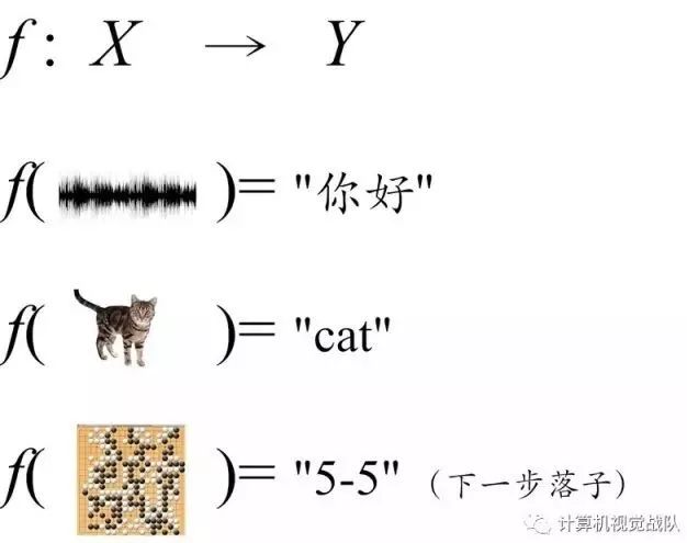 在这样的函数中,针对语音识别功能,如果输入一个音频信号X,那么这个函数Y就能输出诸如“你好”,“How are you?”等这类识别信息。