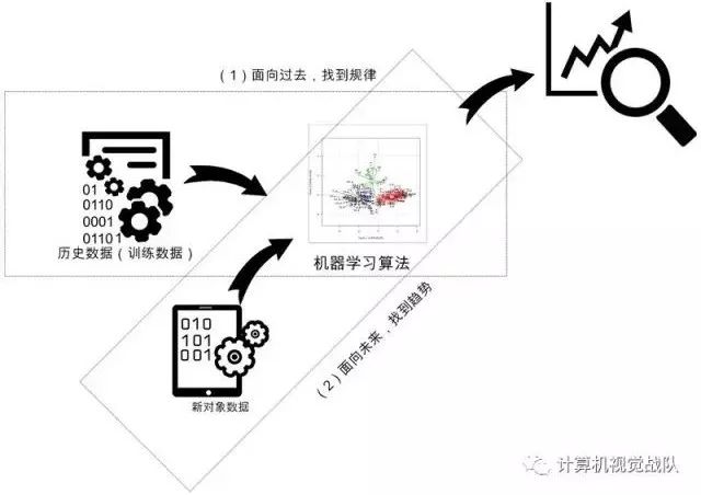 前者主要使用了“归纳”,而后者更侧重于“演绎”。对历史对象的归纳,可以让人们获得新洞察、新知识,而对新对象实施演绎和预测,可以使机器更加智能,或者说让机器的某些性能得以提高。二者相辅相成,均不可或缺。