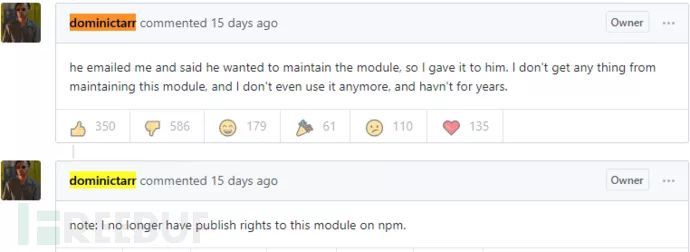 事件起因最早源于event-stream项目原作者@dominictarr因时间精力和兴趣受限,遂通过邮件交流方式,随意地将event-stream项目维护工作交给了另一位根本就不认识的开发者@Right9ctrl,千万级下载量的开源项目就此托管给了陌生人: