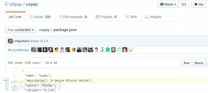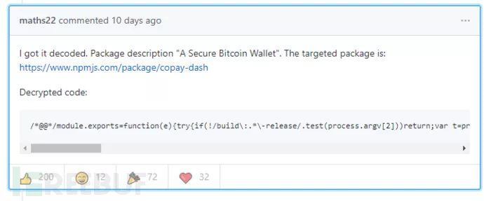 最终,Github用户@maths22对所有NPM包的Description描述字段进行了收集,并暴力破解,他发现用属性描述字段 “A Secure Bitcoin Wallet” 恰好能解密上述数组中AES256加密的第一项n[0]字符串!而巧的是,比特币钱包项目 copay-dash的 description属性正好为此: