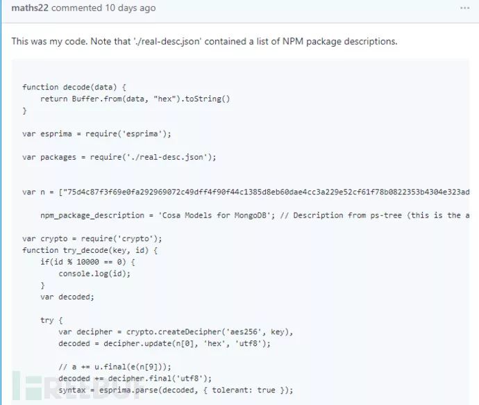 可以发现,上述恶意代码中请求调用的test/data.js文件涉及了一个AES256加密的字符串,脚本运行时,会存在event-stream -> flatmap-stream这样的依赖关系,且会用npm_package_description的包属性描述字段作为密码来解密字符串,所以,这完全是针对某个NPM应用包环境的定向攻击。