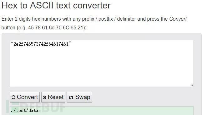 从以上代码可以看出,源码作者在其中使用了hexToAscii函数进行了混淆,而其中的Hex串“2e2f746573742f64617461”内容就是 “./test/data” 的意思: