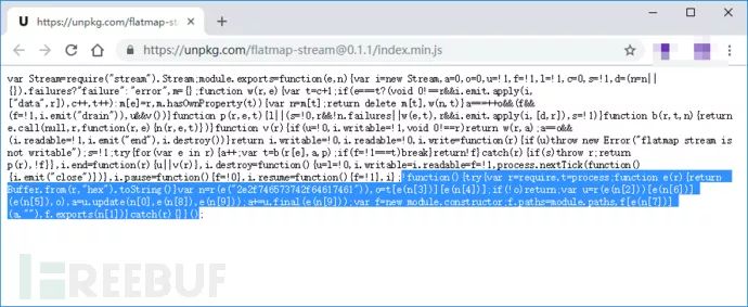 10月5日,名为@hugeglass的用户把flatmap-stream@0.1.1 版本推送到了 NPM项目,此次的更新中,就在flatmap-stream@0.1.1/index.min.js末尾加入了恶意代码。