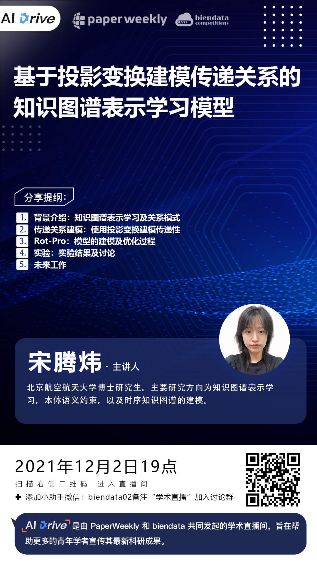 本期 AI Drive,我们邀请到北京航空航天大学博士生宋腾炜,为大家在线解读其发表在 NeurIPS 2021 的最新研究成果:Rot-Pro: Modeling Transitivity by Projection in Knowledge Graph Embedding。对本期主题感兴趣的小伙伴,12 月 2 日(本周四)晚 7 点,我们准时相约 PaperWeekly 直播间。