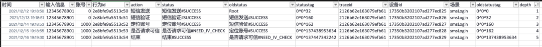 打点数据描述了一个阶段性的结果。上面例子描述的,就是用户在2021-12-1 11:20:54发起了一次账密登录请求,但是因为环境不安全,安全挑战要求核实身份(比如发短信核实),用户操作了核身操作,在2021-12-1 11:21:20发起了免登,下发了登录态。
