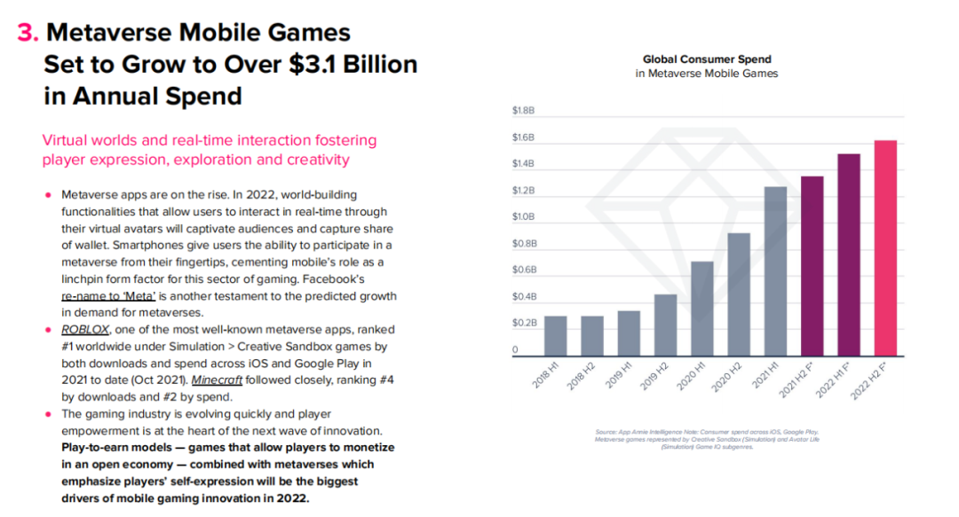 元宇宙应用程序(如 Roblox、Minecraft)的消费者支出将超过 31 亿美元;