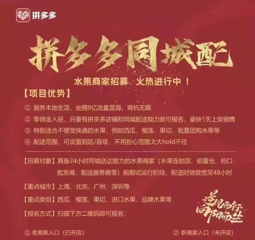 而从拼多多公布的信息来看,由于其没有线下资源作为基础,目前只能筛选有同城配送能力的商家,包括水果连锁店、前置仓、档口批发商、物流配送服务商等,将这类商家的线下门店当做前置仓。