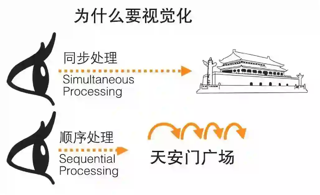 视觉化的方式能够同步处理不同的信息,当我们在看一张图的时候,可以快速地处理图上的所有内容,但如果是阅读一堆文字,就需要逐行逐字去理解,大脑处理图片和文字的过程是不一样的。