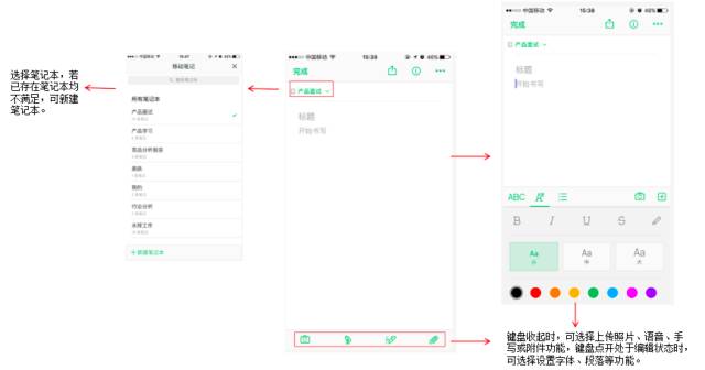 通过APP主界面新建笔记,支持上传照片、语音、附件、手写、字体设置、段落设置等功能。