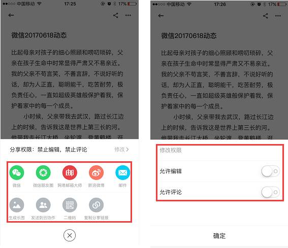 有道云笔记支持分享到微信、新浪等社交空间,是否分享到这些应用不能编辑,而且分享应用种类也比印象笔记少,但能设置分享后能否编辑和评论。