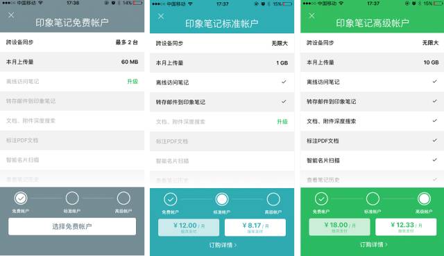印象笔记提供三种账户类型,每种类型下用户有不同的使用功能权限。