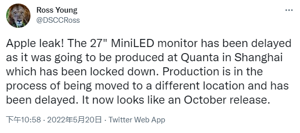 显示器分析师 @DSCCRoss 周五在 Twitter 上透露:传说中采用 mini LED 背光 + ProMotion 可变刷新率技术的 27 英寸“Studio Display Pro”显示器,已被苹果内部给推迟。其援引消息人士的爆料称,苹果原计划在广达电脑(Quanta Computer)的上海工厂生产该设备。但受近年疫情反复的影响,该公司正努力将产线转移到另一个地点。