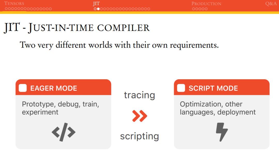 因为 PyTorch 是即时运行模式,这表明它很容易 Debug 或检查代码等。在 PyTorch 1.0 中,其首次引进了 torch.jit,它是一组编译工具,且主要目标是弥补研究与产品部署的差距。JIT 包含一种名为 Torch Script 的语言,这种语言是 Python 的子语言。使用 Torch Script 的代码可以实现非常大的优化,并且可以序列化以供在后续的 C++API 中使用。