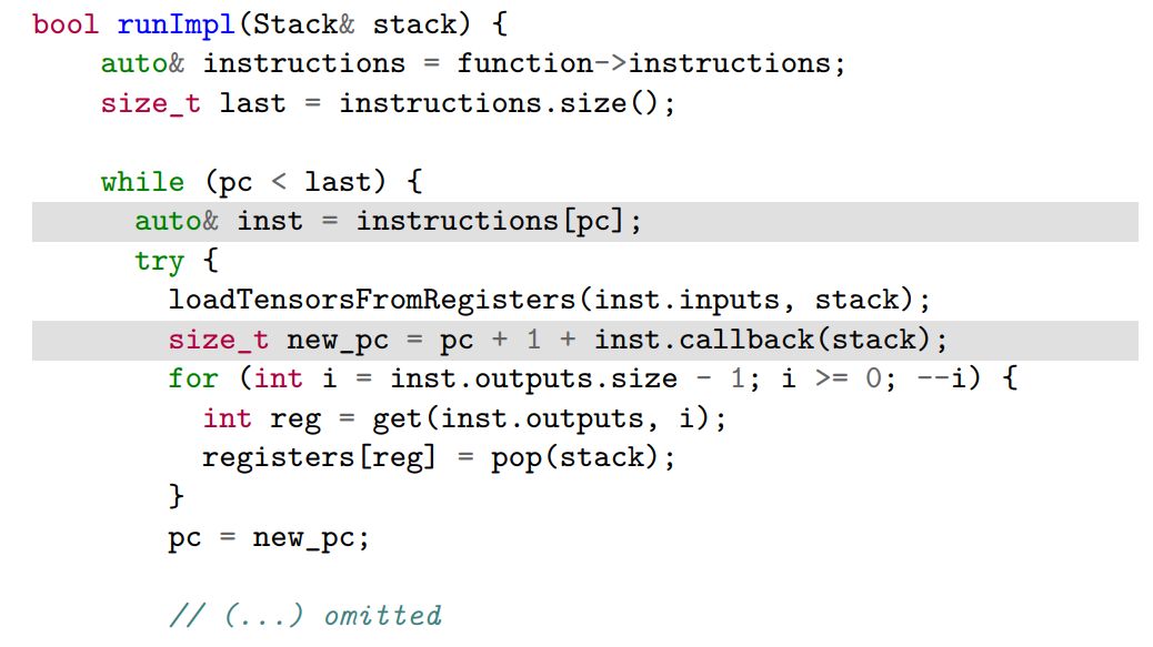 和 Python 解释器可以执行代码一样,PyTorch 在 JIT 过程中也有一个解释器执行中间表征指令: