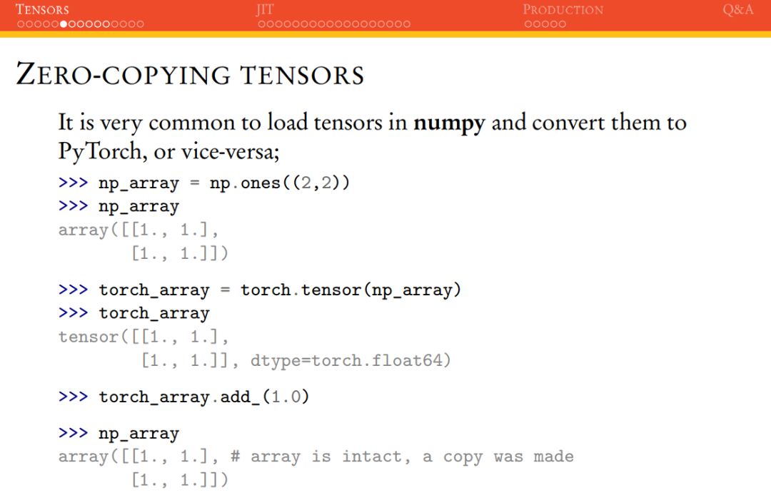 Zero-Copying 的形式确实能省很多内存,但是如上所示在位(in-place)和标准运算之间的区别会有点模糊。如果用 np_array = np_array +1.0,torch_array 的内存不会改变,但是如果用 np_array += 1.0,torch_array 的内存却又会改变。