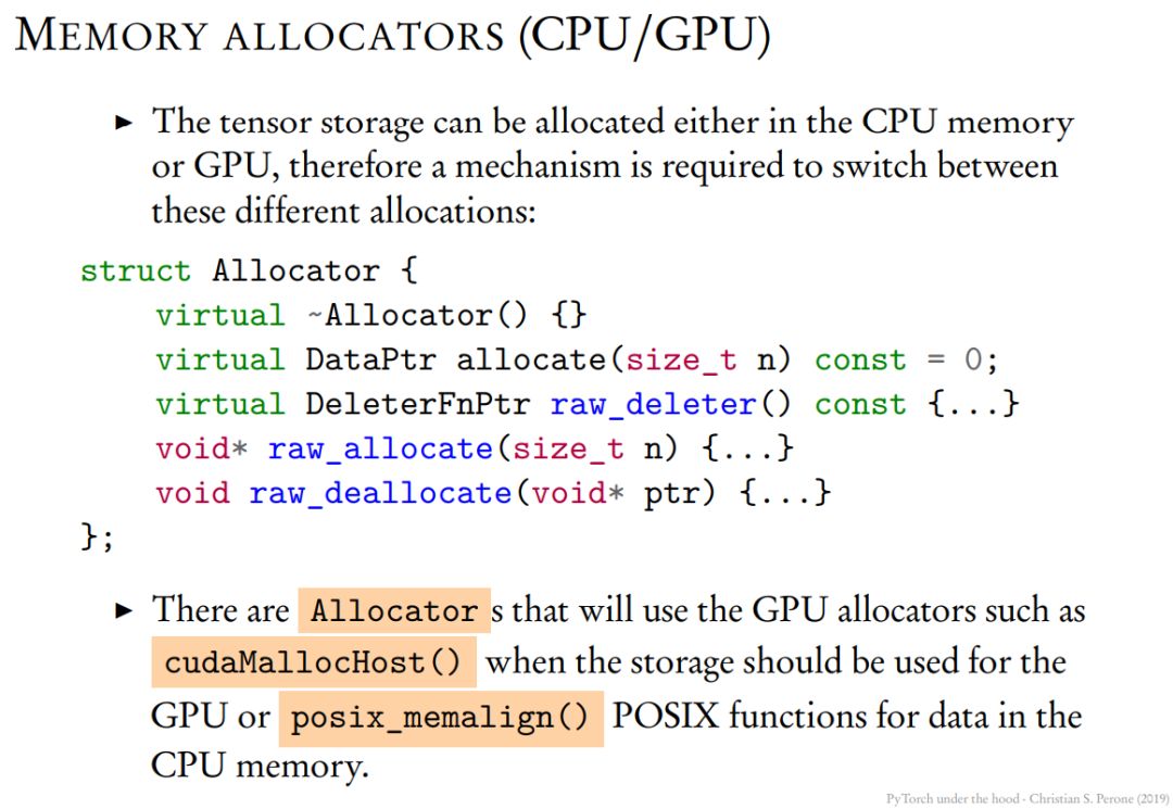 张量的实际原始数据并不是立即保存在张量结构中,而是保存在我们称之为「存储(Storage)」的地方,它是张量结构的一部分。一般张量存储可以通过 Allocator 选择是储存在计算机内存(CPU)还是显存(GPU)。