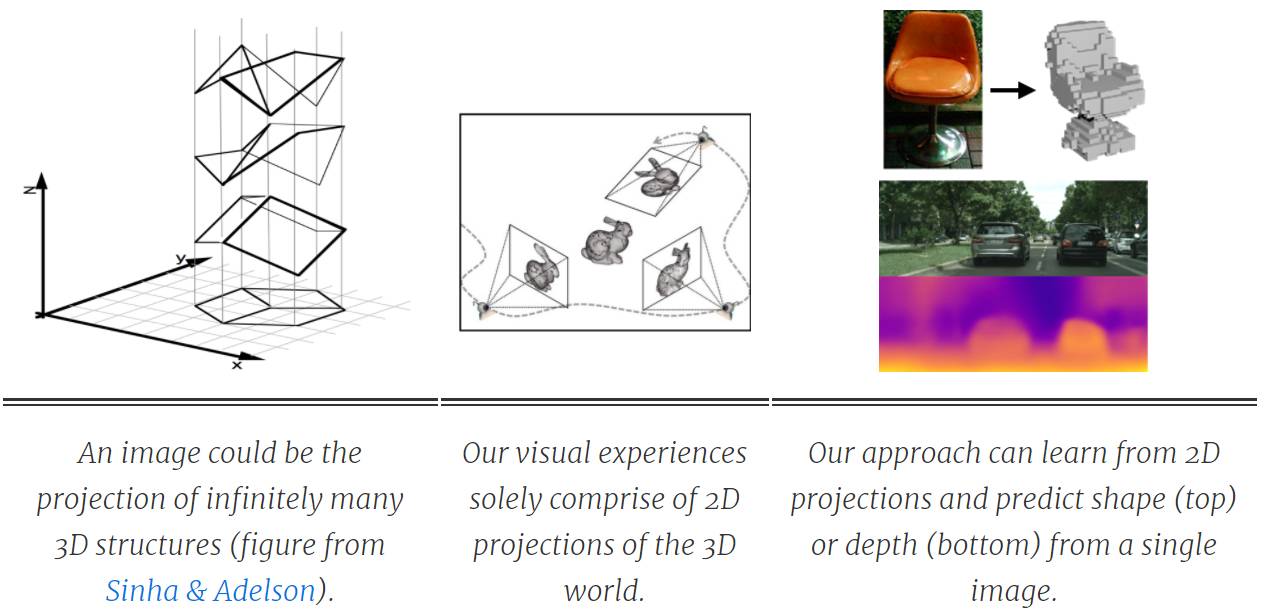 构建单幅图片 3D 推断的计算模型一直是计算机直觉中探讨的问题。早期的 Blocks World(论文:Machine perception of three-dimensional solids)或 3D surface from line drawings(论文:Interpreting Line Drawings as Three-Dimensional Surfaces)等项目都是利用几何线索的显式推理来优化三维结构。近年来,利用监督学习方法可以获得更加真实的设定和三维表征的定性推断(Hoiem et al.)或定量推断(Saxena et al)。在真实设定中获得优秀成果的趋势已经随着目前基于 CNN 实体(e.g. Eigen & Fergus, Wang et al.)的发展而进步,但它是以增加直接 3D 监督为代价的,所以这种范式相当有限。获得这种大规模监督数据的成本是巨大的,因此我们希望我们的计算系统能像人一样不需要 3D 监督而学习进行 3D 预测。
