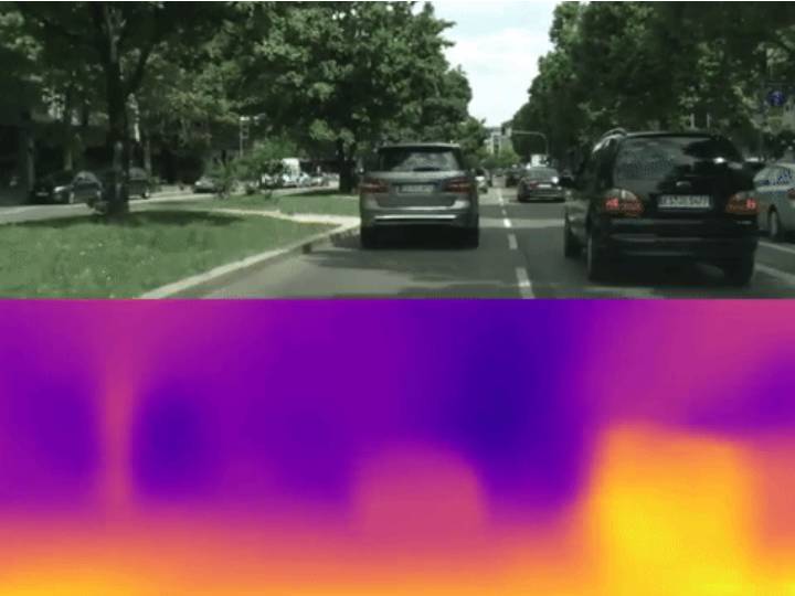 研究人员在 KITTI 和 Cityscapes 数据集中训练并评估了新系统的性能,其中包括汽车在市内行驶时驾驶员视角的视频片段。下图展示了我们的单视角深度网络逐帧(即时且平滑)预测的能力。
