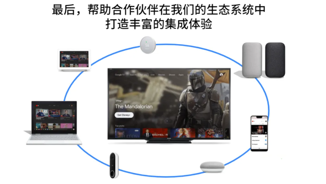 Google TV 连接了其他智能互联家居生态系统,帮助合作伙伴在谷歌生态系统中打造丰富的集成体验。