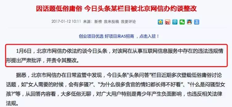 2017年1月,北京市网信办对今日头条“头条问答”栏目中的低俗问答,提出严肃批评,并责令其整改。