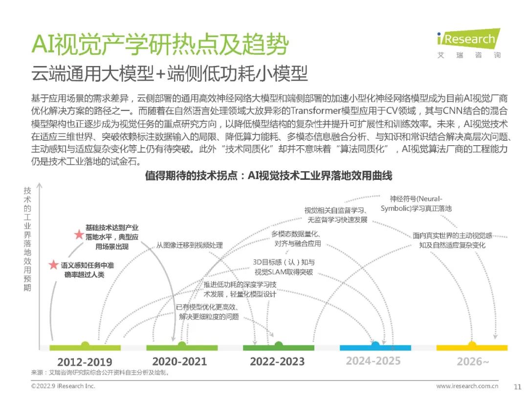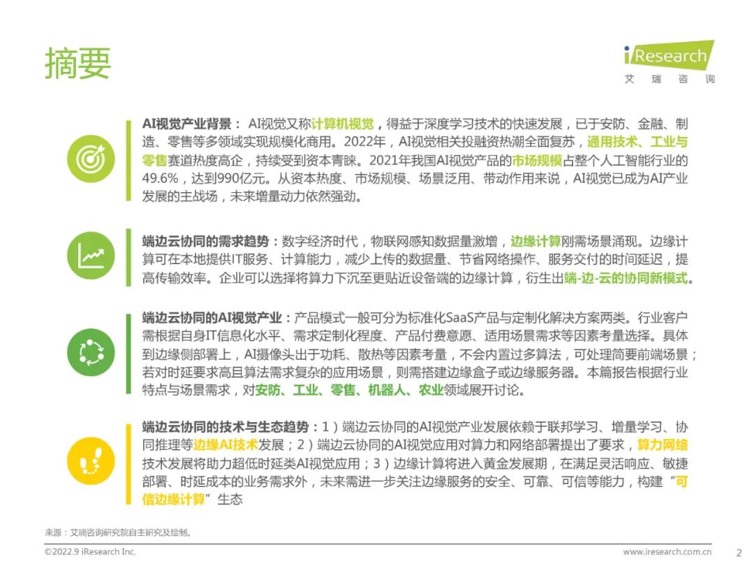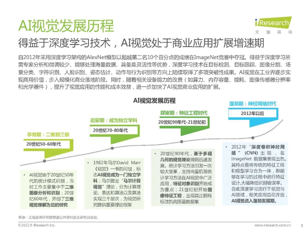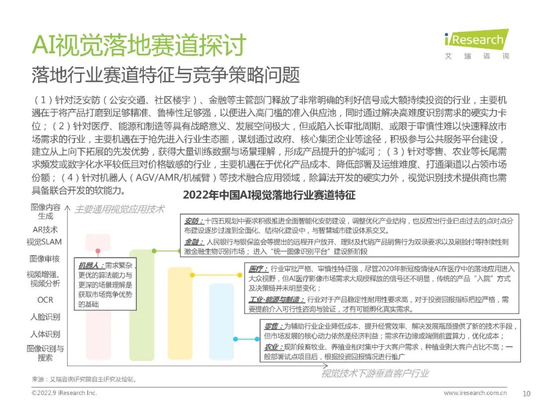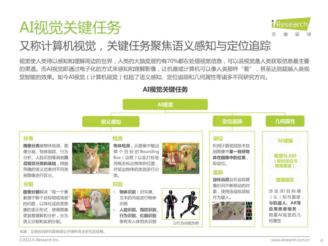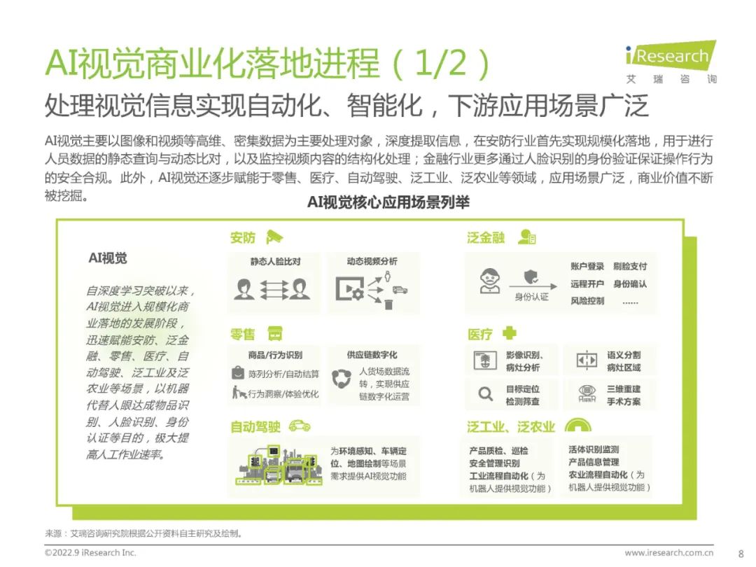 AI视觉产业背景:AI视觉又称计算机视觉,得益于深度学习技术的快速发展,已于安防、金融、制造、零售等多领域实现规模化商用。2022年,AI视觉相关投融资热潮全面复苏,通用技术、工业与零售赛道热度高企,持续受到资本青睐。2021年我国AI视觉产品的市场规模占整个人工智能行业的49.6%,达到990亿元。从资本热度、市场规模、场景泛用、带动作用来说,AI视觉已成为AI产业发展的主战场,未来增量动力依然强劲。