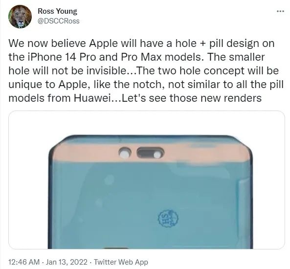 然而,一则新爆料显示,今年 iPhone 14 Pro 所采用的很可能不是三星、华为等采用过的“药丸”形状,而是一个横向的感叹号,颇为别致。显示屏供应链咨询的 Ross Young 表示,新 iPhone “感叹号”的那一点用于放置 Face ID 点阵式投影,不可隐藏,条状区域放置前置摄像头、红外摄像头等模组。
