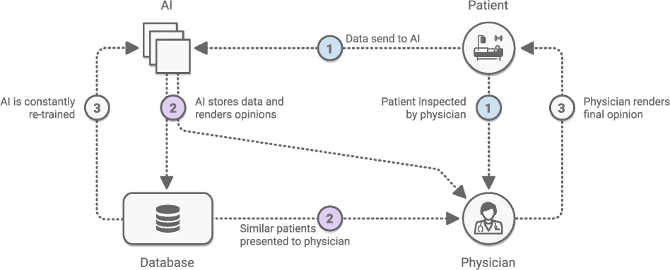 图 5:临床部署。该示例工作流程展示了 AI 增强工作流的积极效果,以及可建立起的信任。人工智能的预测结果为医生提供了直接价值,而随着收集到的数据增加,这种能力还会不断提升。