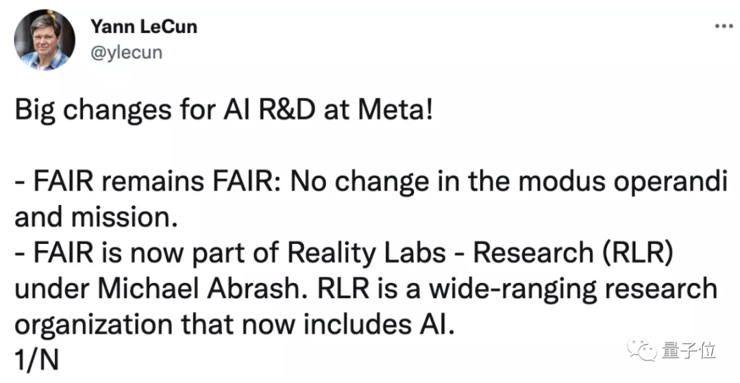 首先,他确认了FAIR将成为Reality Labs研究部门(RLR)下属组织,受Michael Abrash领导,而AI只是RLR研究范围中的一部分。