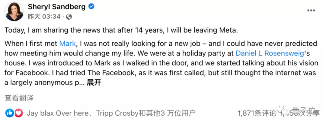 值得一提的是,在Sandberg这篇“千字告别信”中,也只字未提对元宇宙的展望或看法,只是回顾了自己过去十几年来在Meta的工作感受。