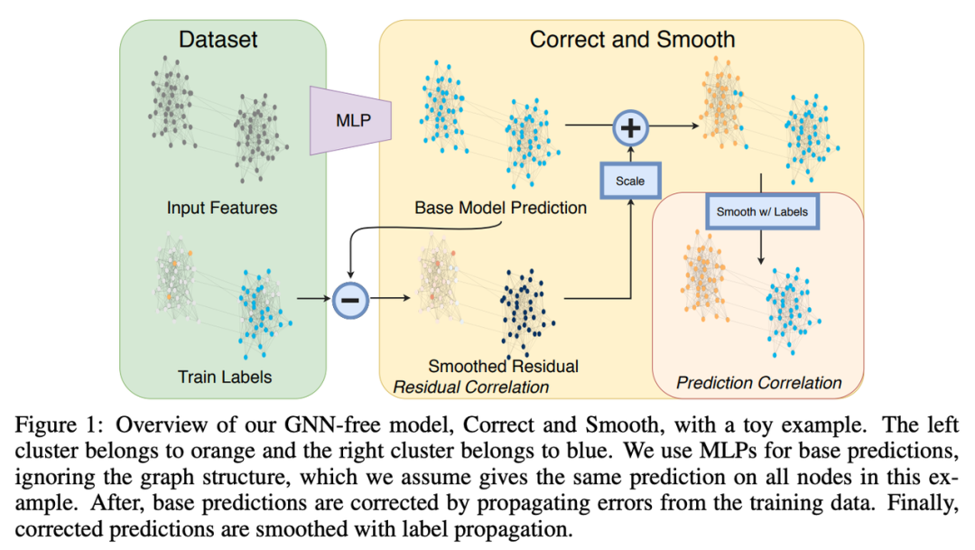 Huang, He 等人在 ICLR’21 上展示了 Correct & Smooth — 一个通过标签传播改进模型预测的简单程序。 仅与 MLP 配对,该方法在不使用任何 GNN 且参数少得多的情况下以最高分冲击 OGB 排行榜! 今天,几乎所有 OGB 节点分类赛道中的顶级模型都使用 Correct & Smooth 来压缩更多的点。