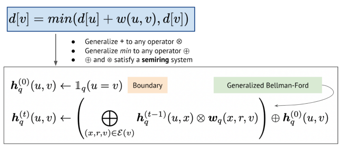 一种是 Zhu 等人的神经 Bellman-Ford 网络,其中将经典的 Bellman-Ford 推广到了更高级别的框架,并展示了如何通过使用特定运算符实例化框架来获得其他经典方法(如 Katz 指标、PPR 、最宽路径等)。更重要的是,该研究表明泛化的 Bellman-Ford 本质上是一种关系 GNN 架构。 NBFNet 不学习实体嵌入,这使得模型通过泛化到未见过的图而获得了归纳性。该模型在关系图和非关系图上的链接预测任务上都表现出色。在 KG 的应用上,NBFNet 给 FB15k-237 和 WN18RR 两个数据集带来了自 2019 年以来最大的性能提升,同时参数减少了 100 倍。