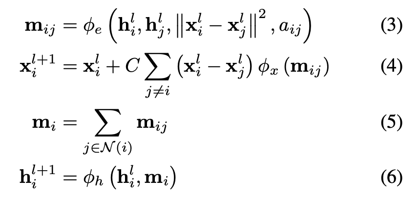 与 vanilla GNN 的主要区别:等式 3 和 4 将物理坐标添加到消息传递和更新步骤中。图源:Satorras, Hoogeboom, and Welling