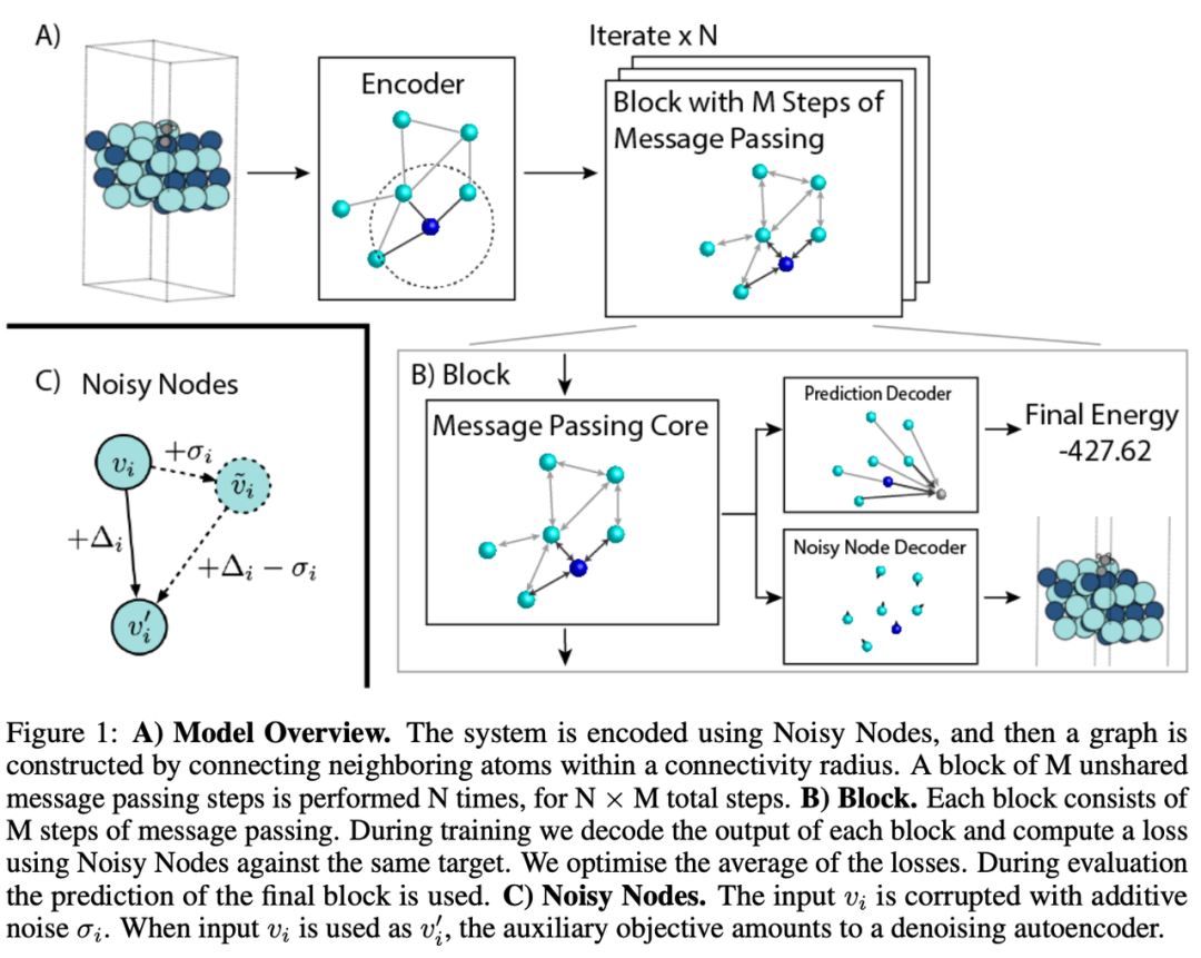 Godwin 等人提出了一种利用循环学习深度 GNN 的方法——在块(Block)中组织消息传递步骤,每个块可有 M 个消息传递层。然后循环应用 N 个块,这意味着有多个块共享权重。如果有 10 个消息传递层和 10 个块,你将得到一个 100 层的 GNN。其中一个重要的组成部分是 Noisy Nodes 正则化技术,它会干扰节点和边的特征并计算额外的去噪损失。该架构能更好地适用于分子任务,研究团队还在 QM9 和 OpenCatalyst20 数据集上进行了评估。
