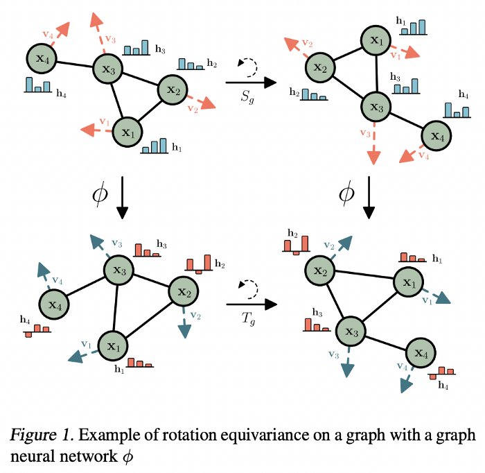 在等变模型中,尽管变换的顺序不同,但我们都能到达相同的最终状态。图源:Satorras, Hoogeboom, and Welling