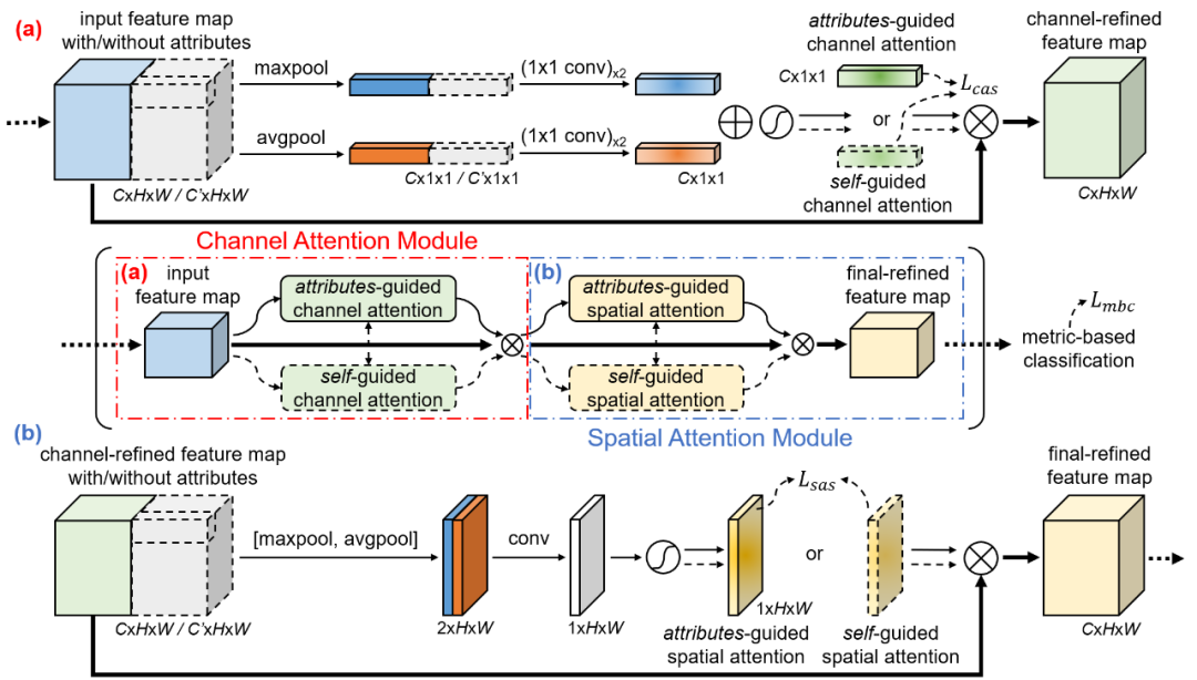 AGAM的总体架构。取决于图像的属性标注是否可得,属性指导分支和自我指导分支中的一支被选择。输入的特征依次经过 (a) 通道注意力模块和 (b) 空间注意力模块来获得最终改善的特征。